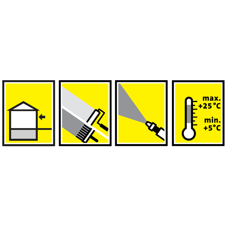 Töötemperatuur: Pinnale kandmisel aluspinna ja õhutemperatuur mitte alla +5°C. Välispindu mitte töödelda sademete ajal.